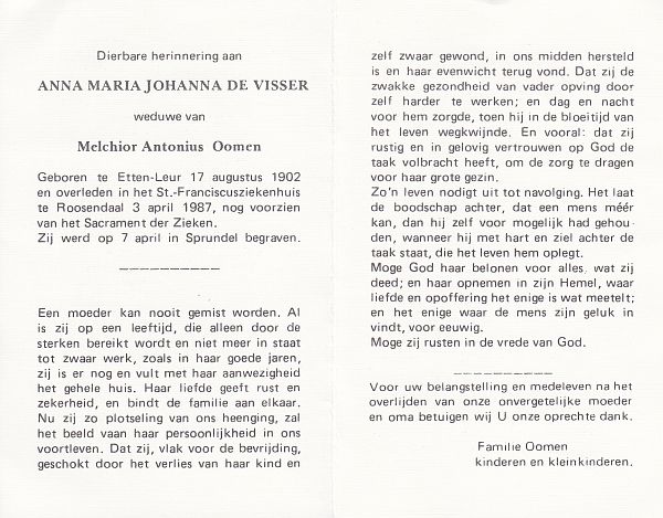 | Anna Maria Johanna | de | Visser | 1902 | 1987 | |